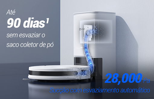 Não é necessário esvaziar manualmente a lixeira do robô. O RC3 Plus funciona com a base de carregamento para aspirar automaticamente a sujeira e os detritos. O saco coletor de pó de grande capacidade, 4 L, localizado na base comporta até 90 dias de resíduos.