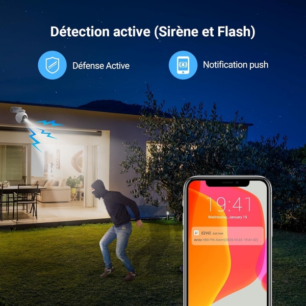 La fonction de défense active de la caméra offre une protection supplémentaire. Dès la détection du mouvement d’un individu, la caméra déclenche une sirène puissante et fait clignoter deux projecteurs⁵ pour immédiatement le faire fuir.