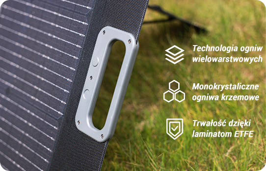 • Wodoodporność i trwałość: zbudowany z ogniw słonecznych laminowanych ETFE, panel słoneczny jest bardzo odporny na warunki atmosferyczne i cechuje się długą trwałością. Panel posiada obudowę klasy IP67, zapewniającą ochronę przed deszczem i śniegiem.